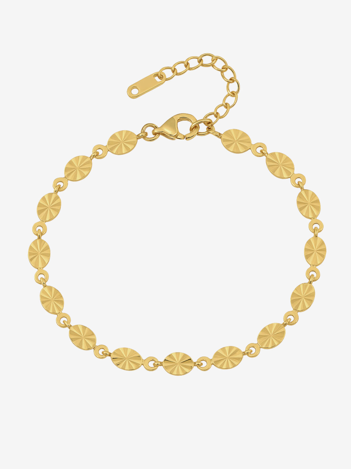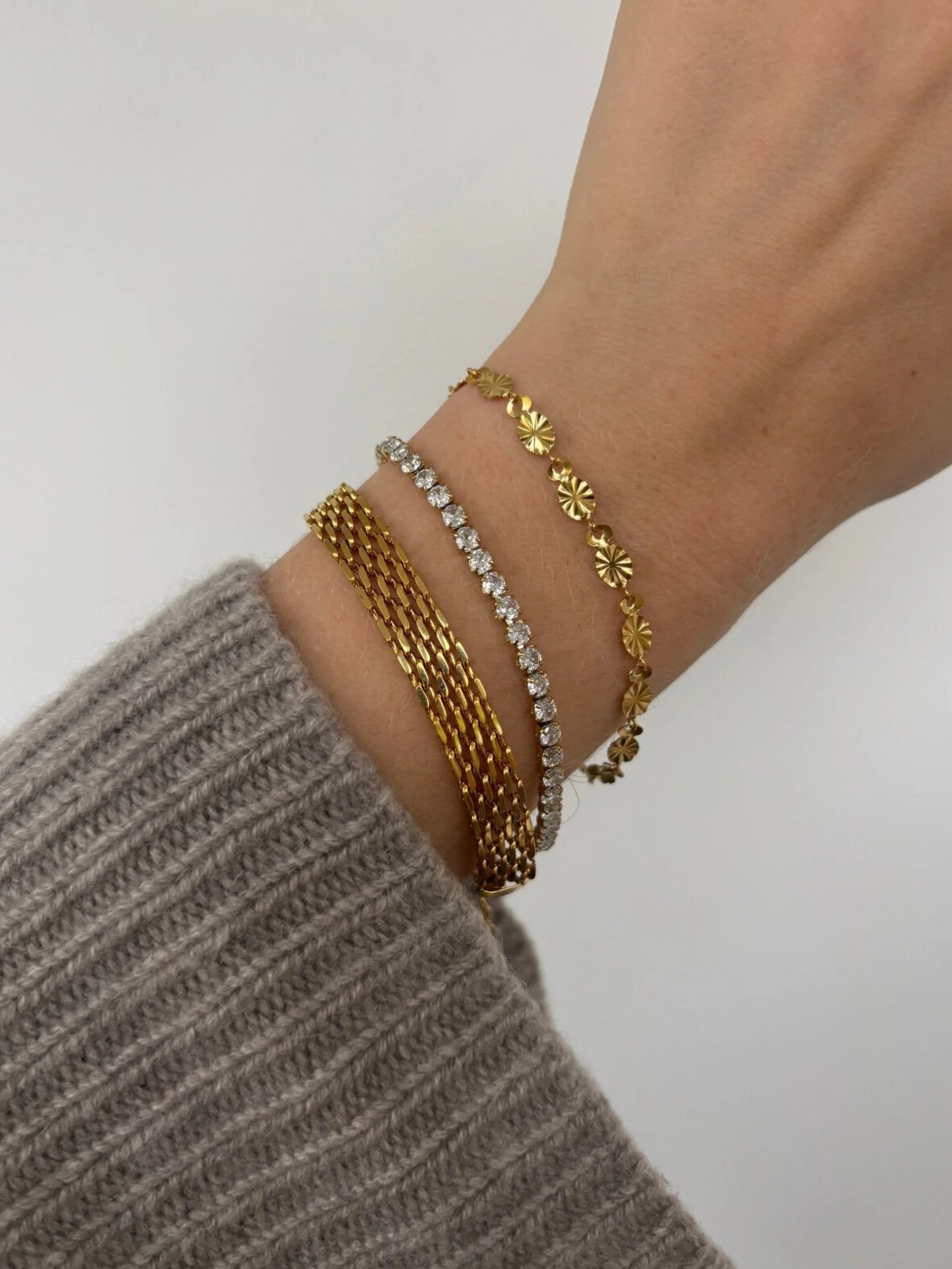 Soleil Armbåndet består af fine, stråleformede led, der spiller med lyset og tilføjer et elegant skær til dit håndled. Dette smukke armbånd er ideelt til både hverdagsbrug og festlige anledninger, og det bringer et strejf af solens varme og elegance ind i dit look. Perfekt for dem, der elsker delikate detaljer med en unik charme.