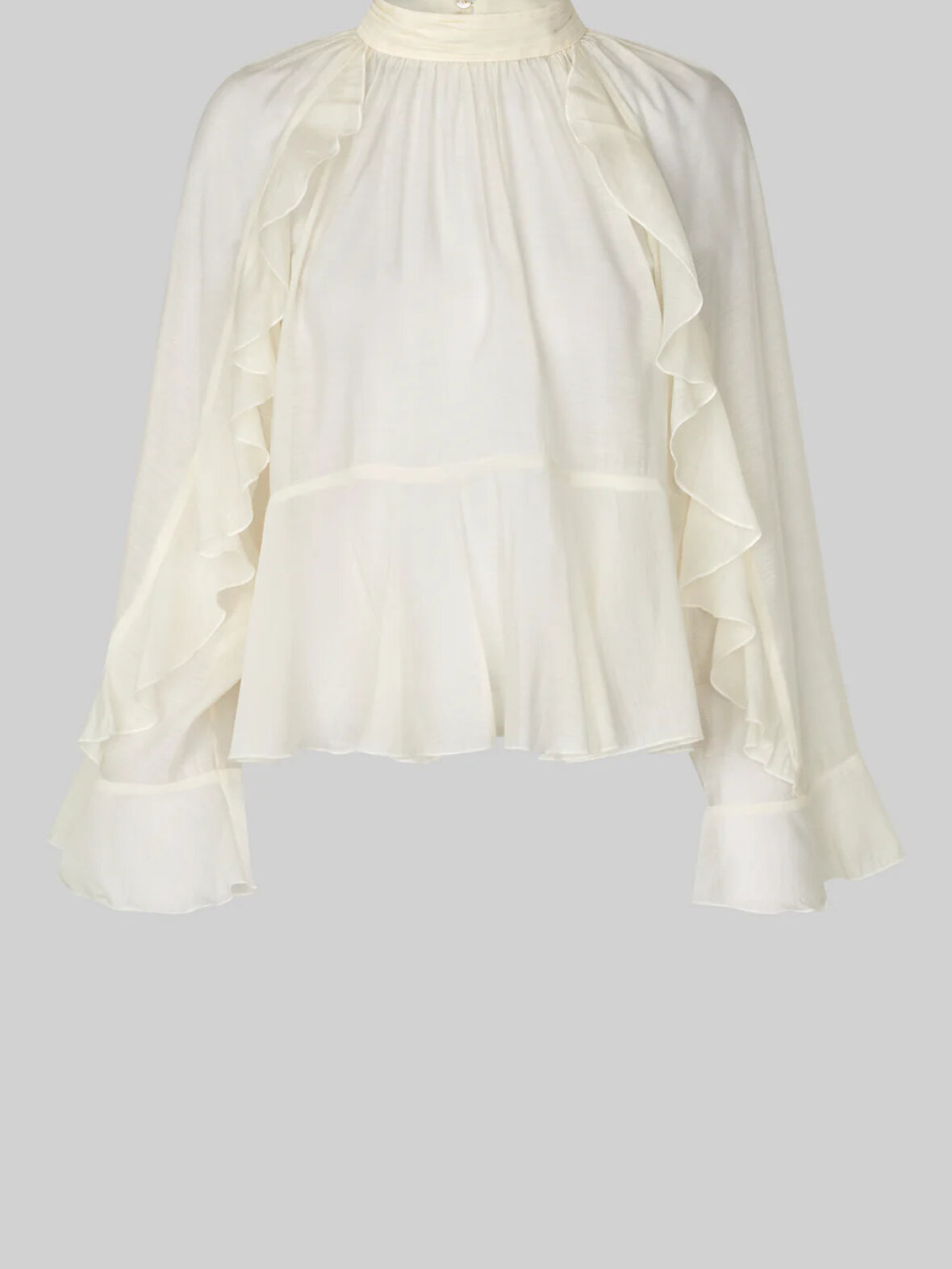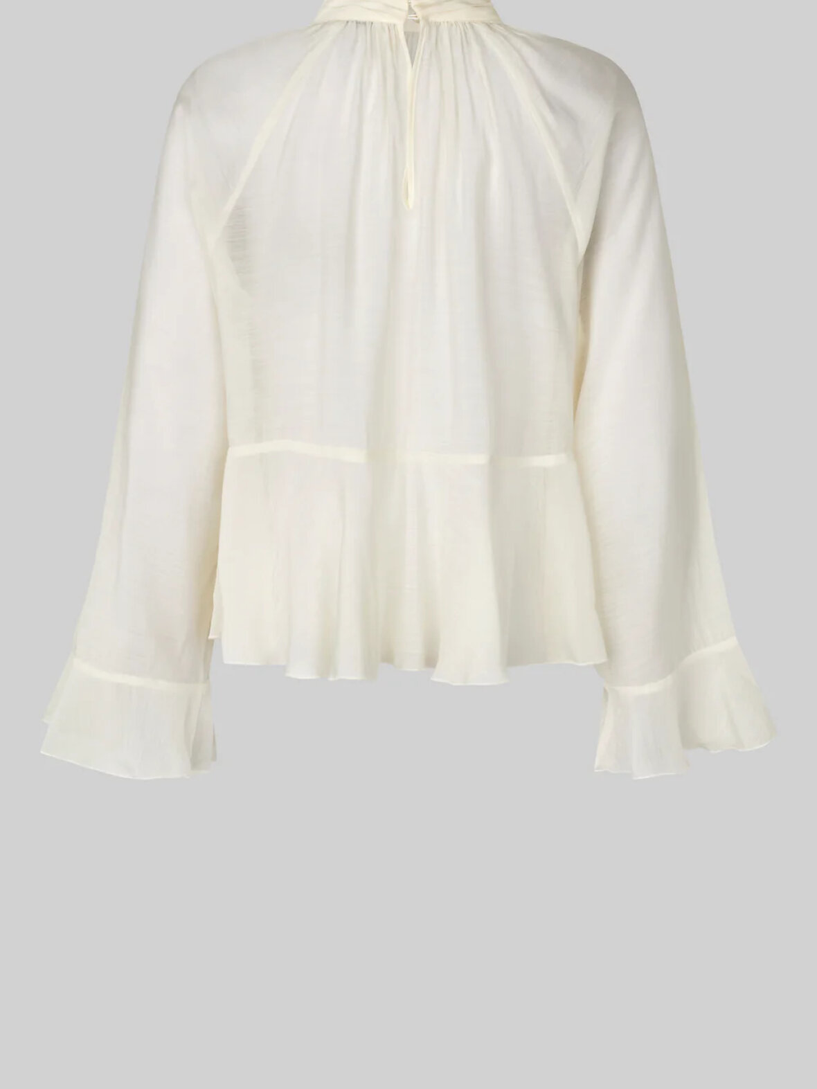 Second Female florlet flæsebluse. Blusen er fremstillet i florlet letvægtsmateriale. Med knaplukning i nakken. Flæsedetalje ved skuldre og ærmer og bred talje med peplum. Lange ærmer med flæsemanchetter. Løs og luftig pasform.
