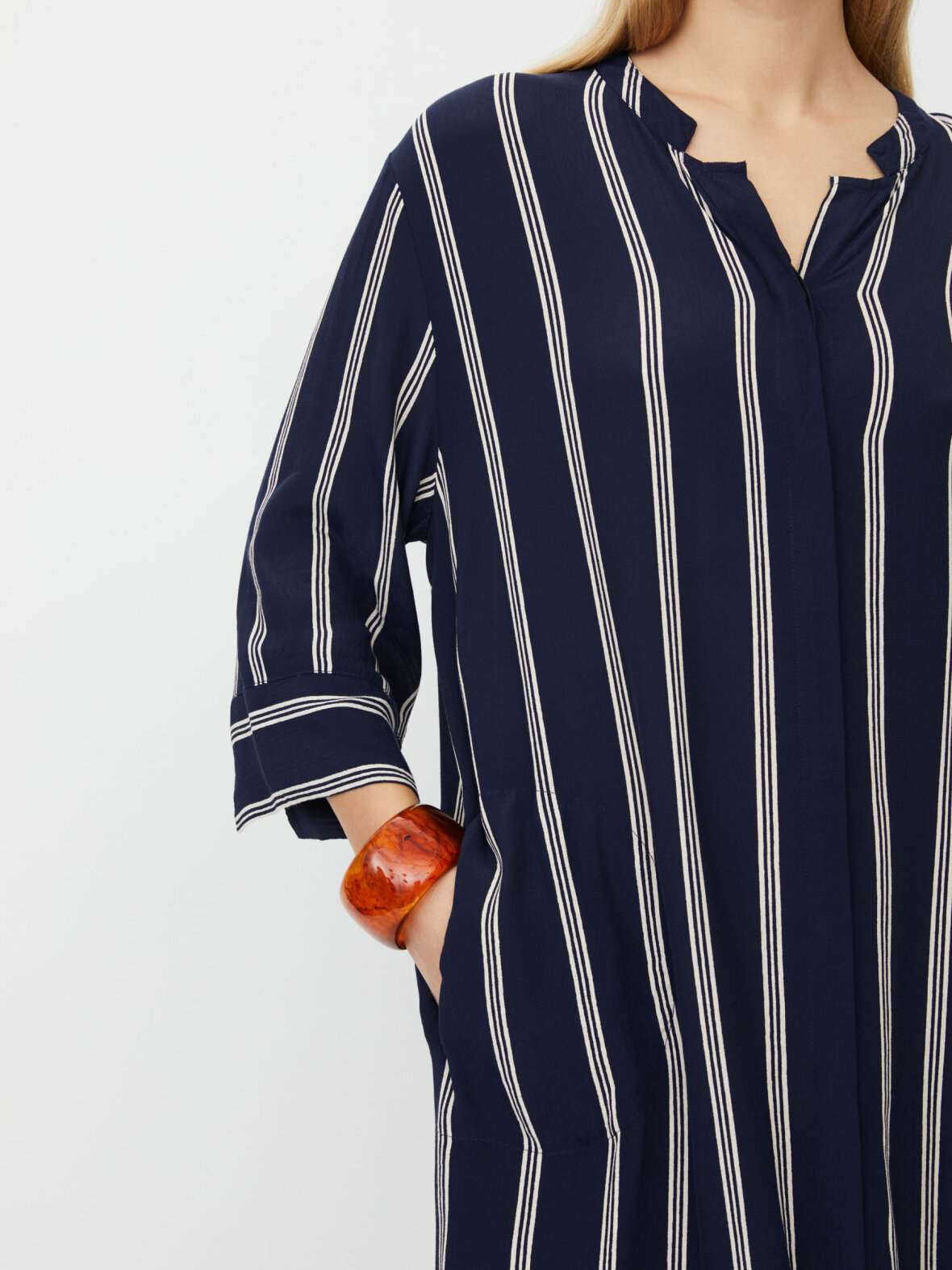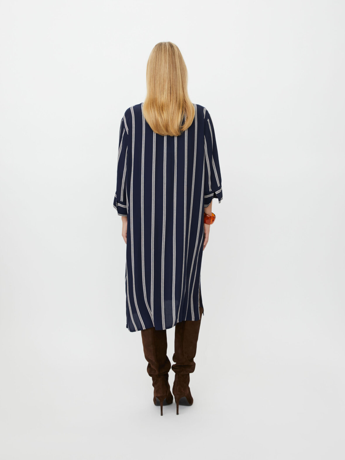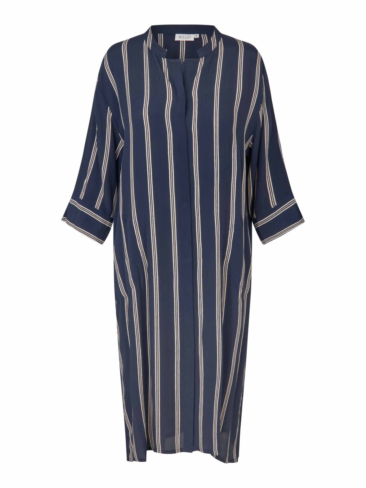 Denne tidløse skjortekjole er et ikonisk Masai-design, perfekt til at skabe et ubesværet, feminint look. Det løse, afslappede snit falder blødt og behageligt ned over kroppen, og designet byder på fine detaljer som slidser i siderne, en lille slids på ærmerne og praktiske stiklommer. Brug den alene for et stilrent udtryk, eller style den med bukser under for et smart lag-på-lag look.