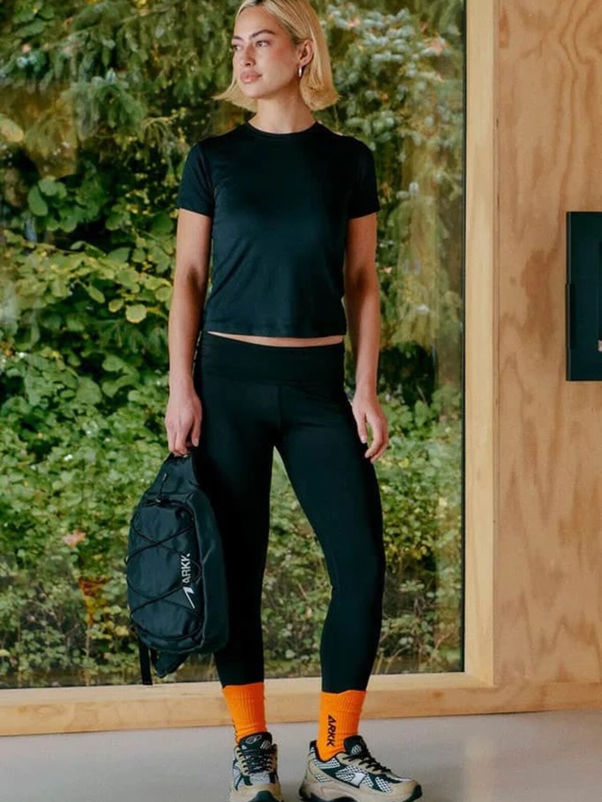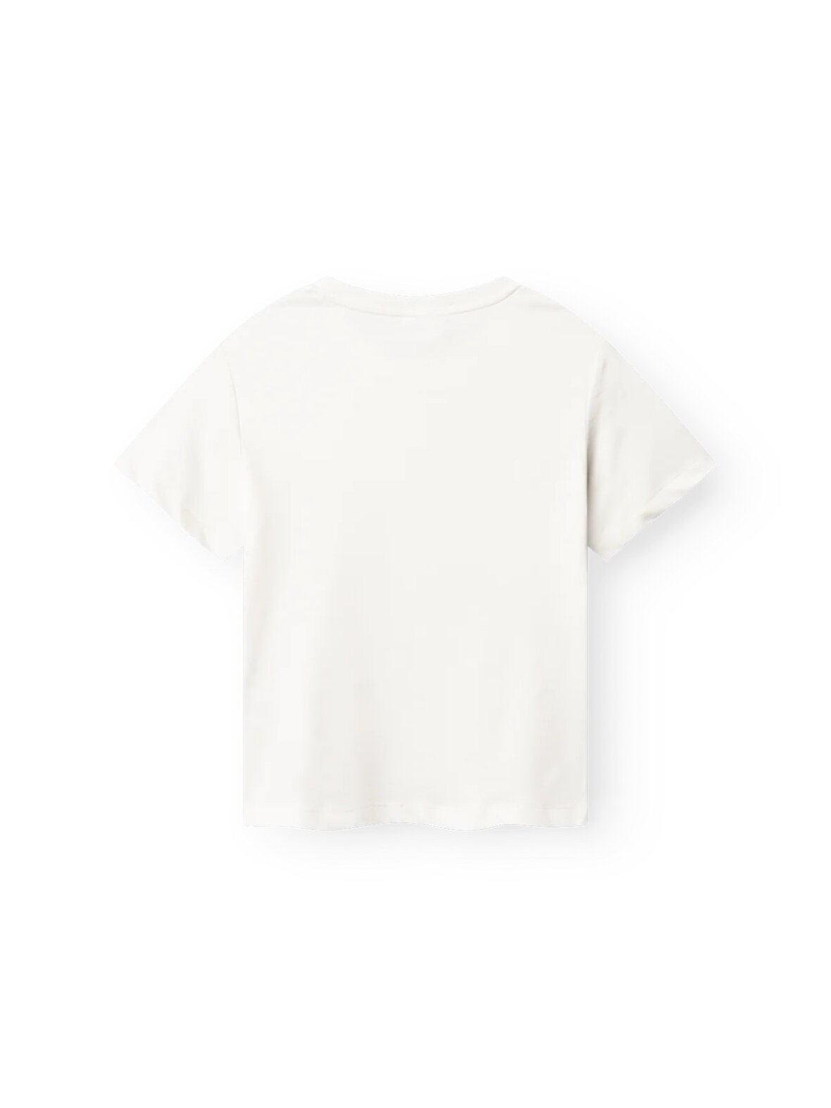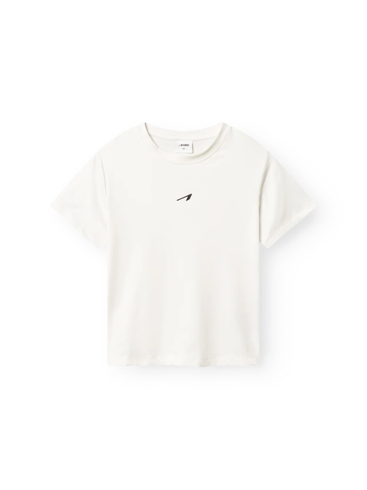 Baby-T-shirt er fremstillet af en teknisk blanding af 88% genbrugspolyester og 12% spandex, hvilket giver en let, åndbar og fleksibel fornemmelse. Stoffet bevarer sin form og blødhed, hvilket gør det ideelt til både bevægelse og hverdagsbrug.