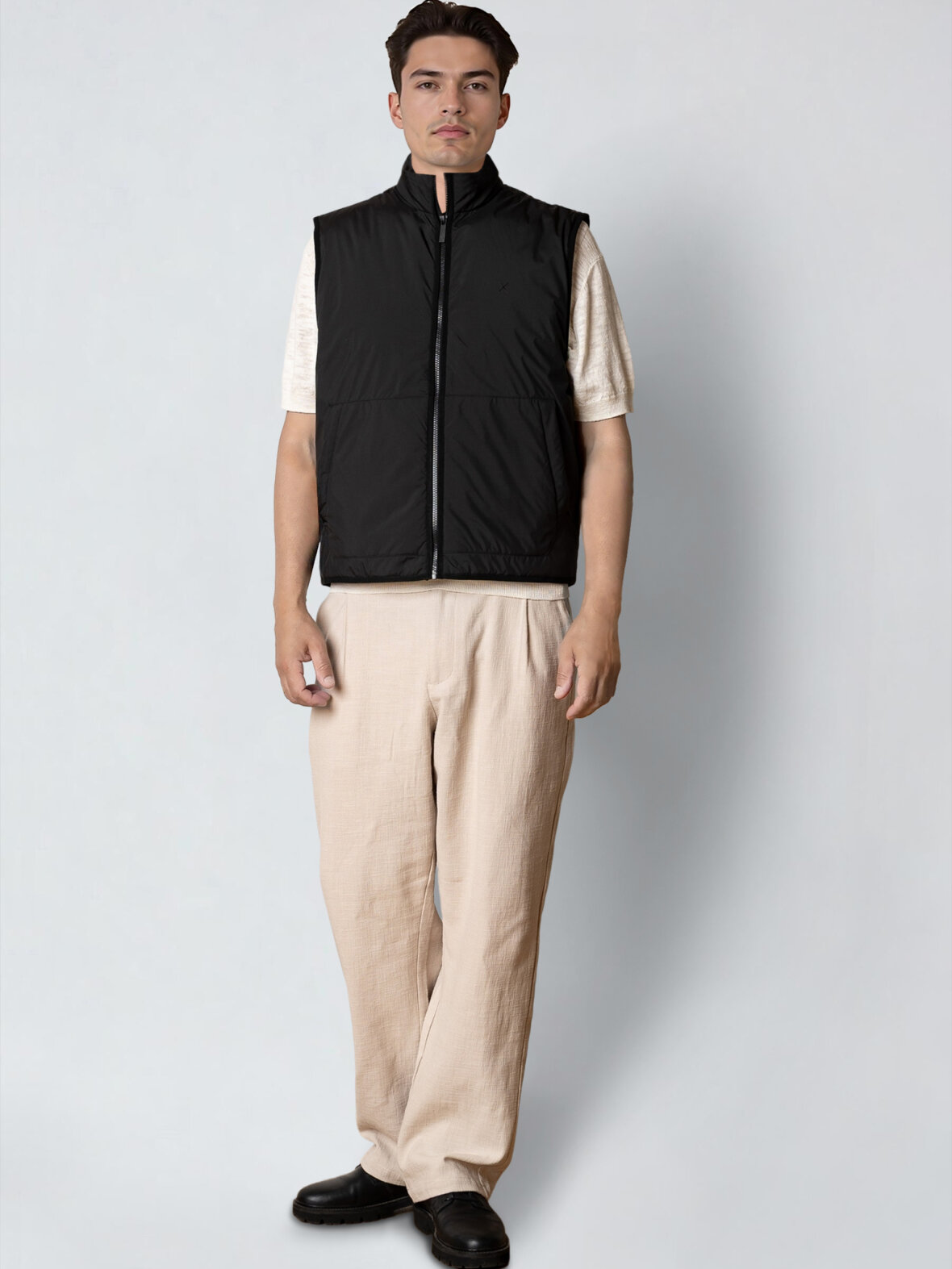 Vesten er lavet af ripstop-stof (så den er let vandafvisende), med let polstring og et indvendigt for af Reborn-genbrugspolyesterfiber. Sidelommer.