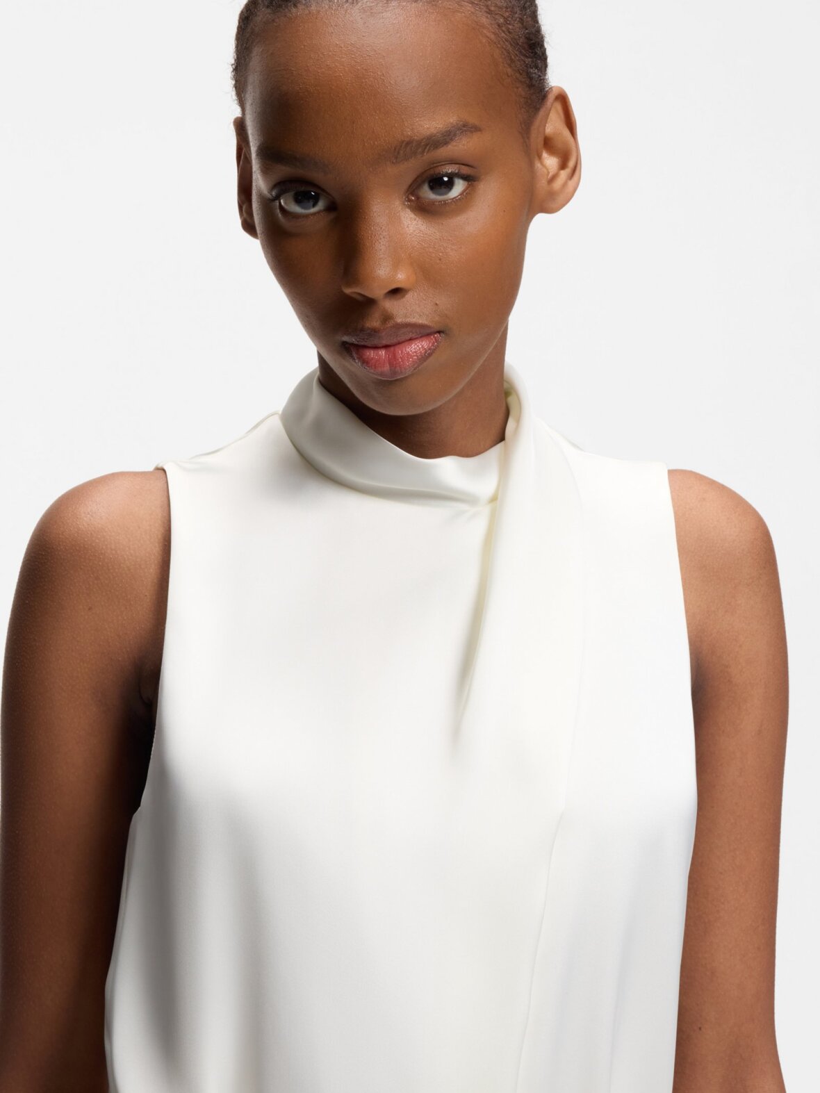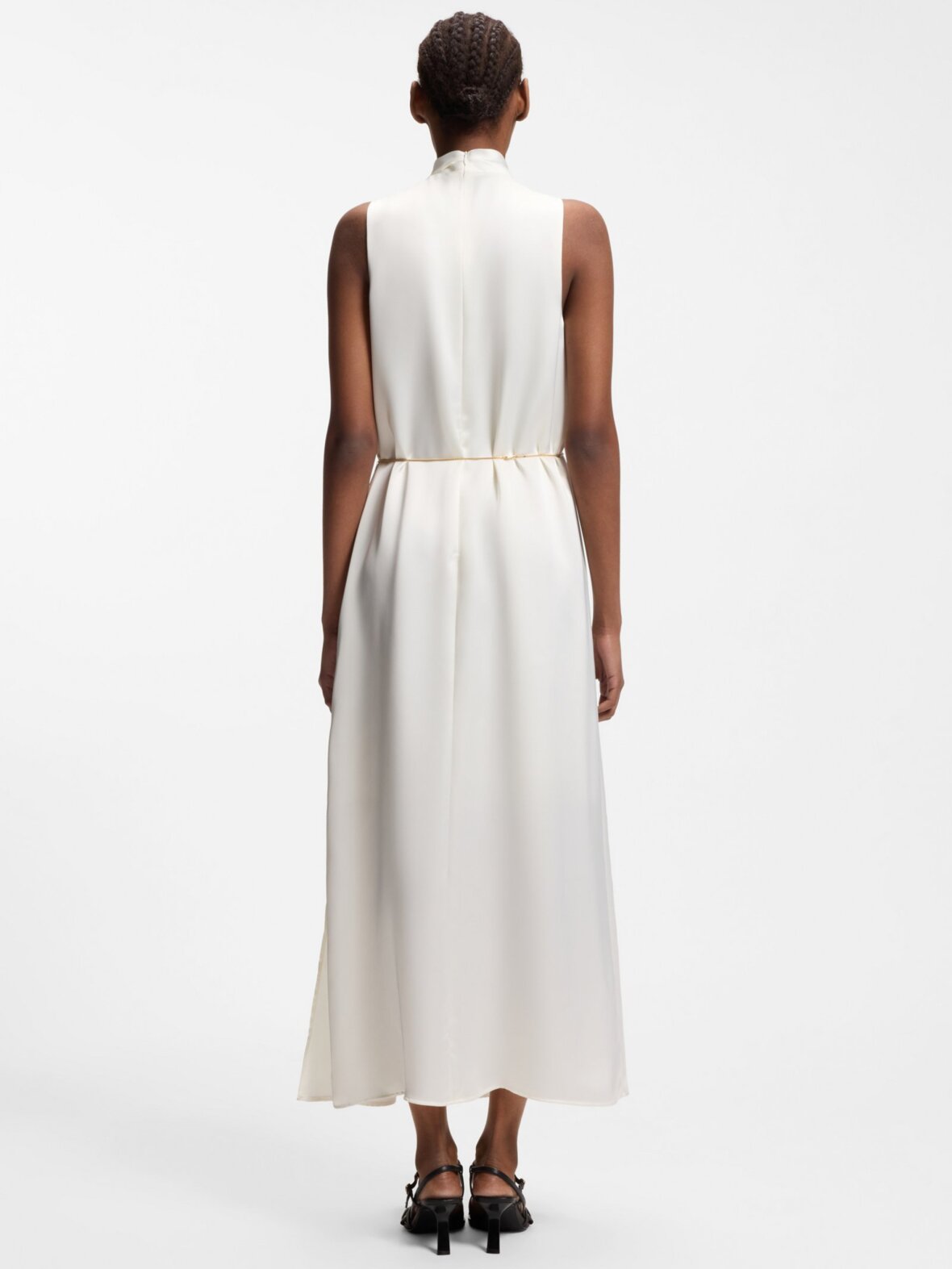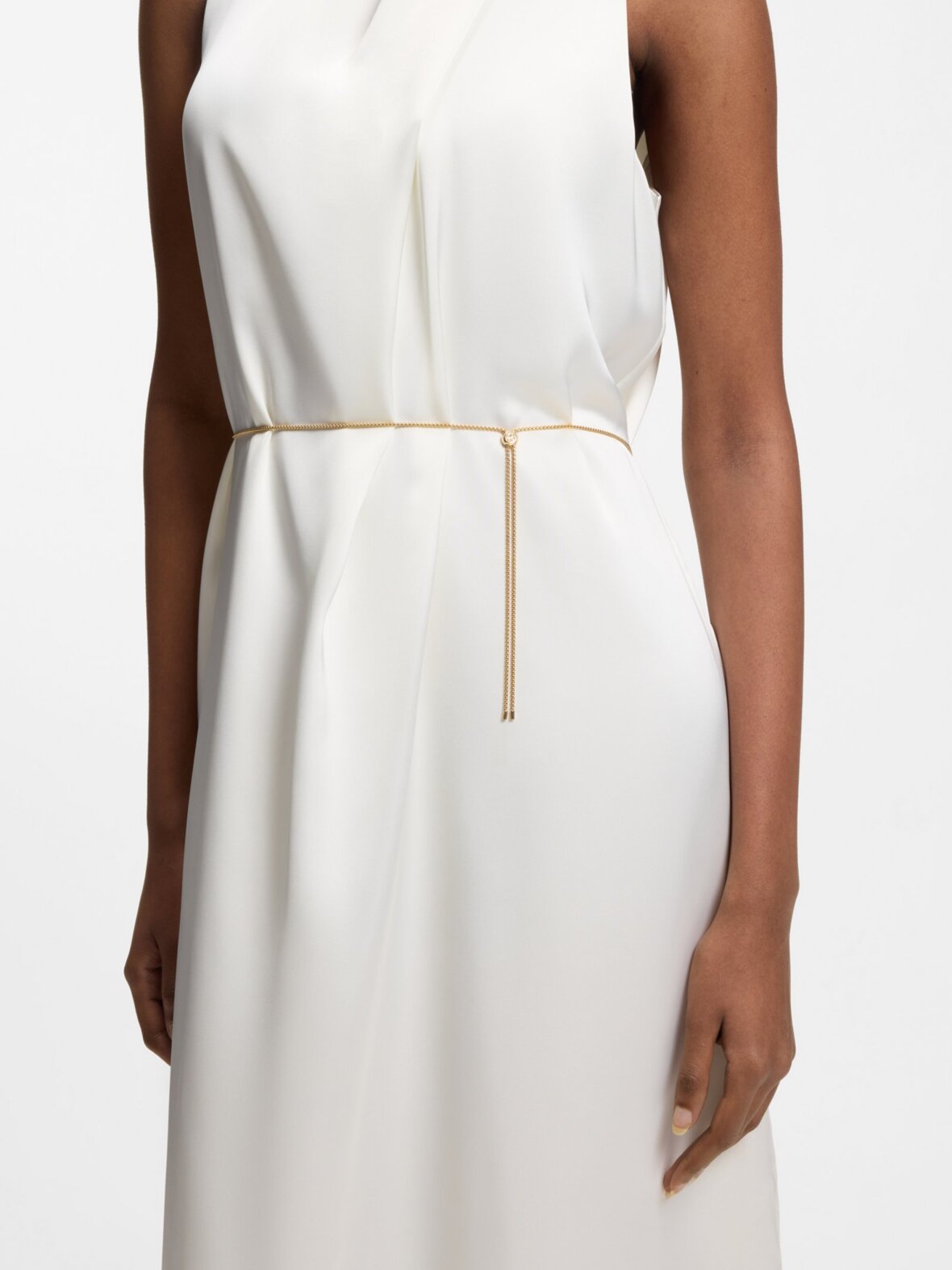 Denne HUGO Womenswear-kjole er fremstillet i flydende satin med elegant drapering og har et raffineret præg. Aftageligt guldfarvet kædebælte. Slids i siden.