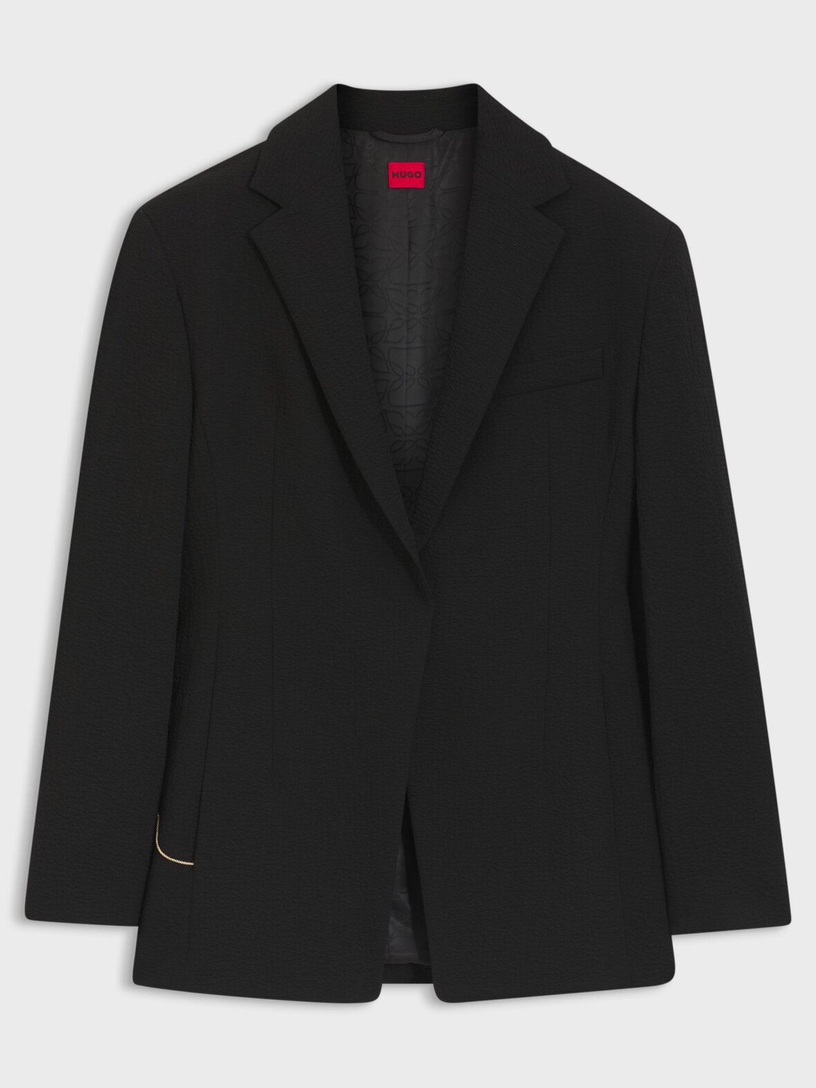 Denne moderne HUGO Womenswear blazer er fremstillet i stretch seersucker og har et elegant kædebælte i en gylden tone. Afslappet pasform med lige skulder. Skjult lukning.