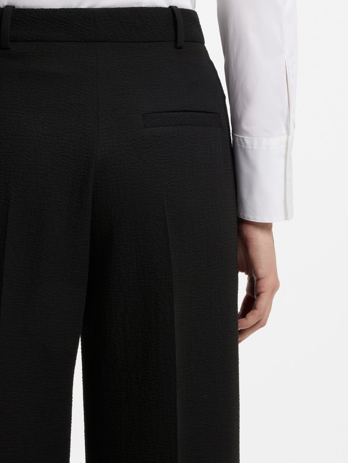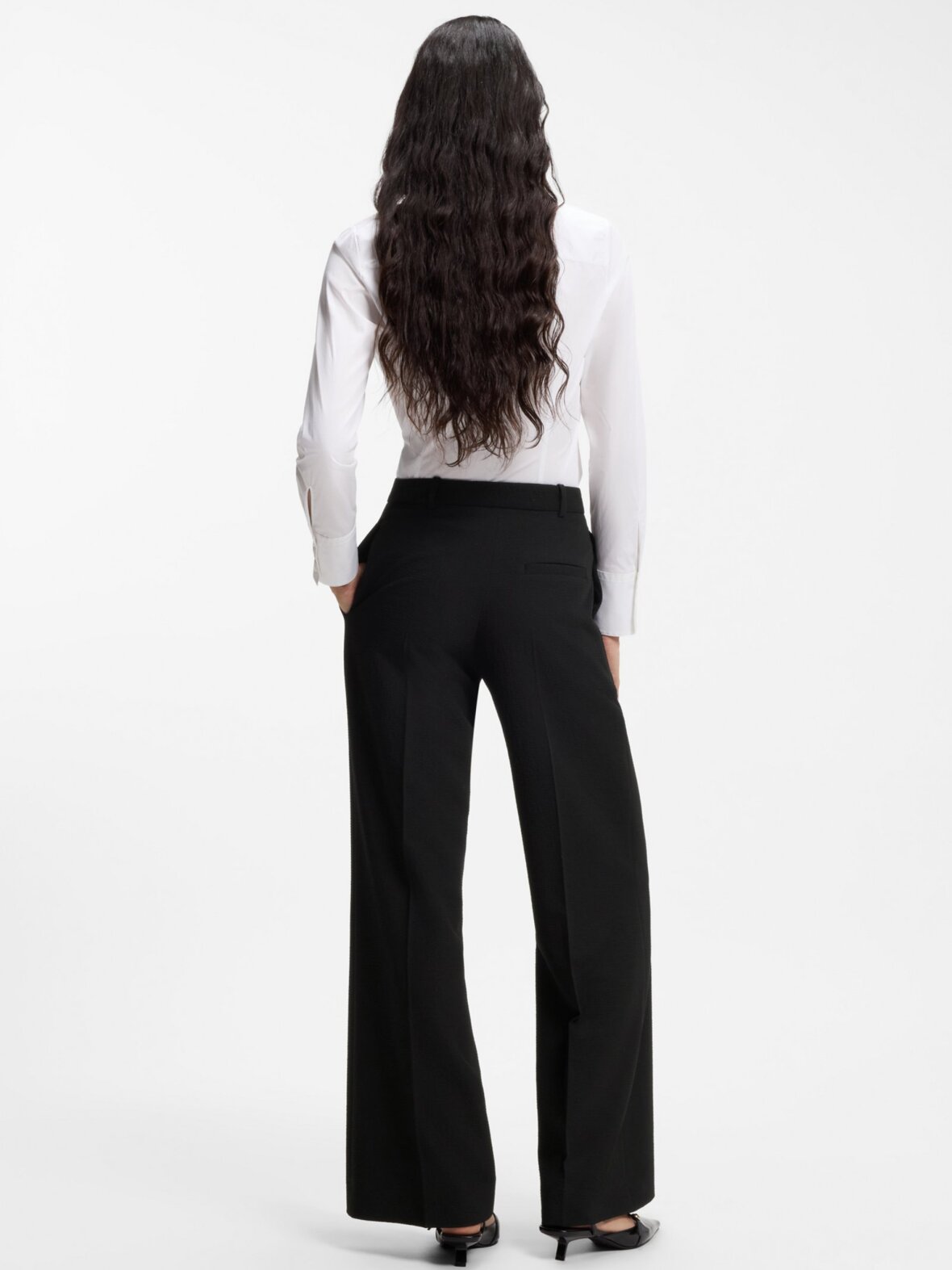 Disse højtaljede HUGO Womenswear-bukser har en lige pasform med vide ben og skaber en moderne profil. Fremstillet i stretch-seersucker for nem bevægelse.