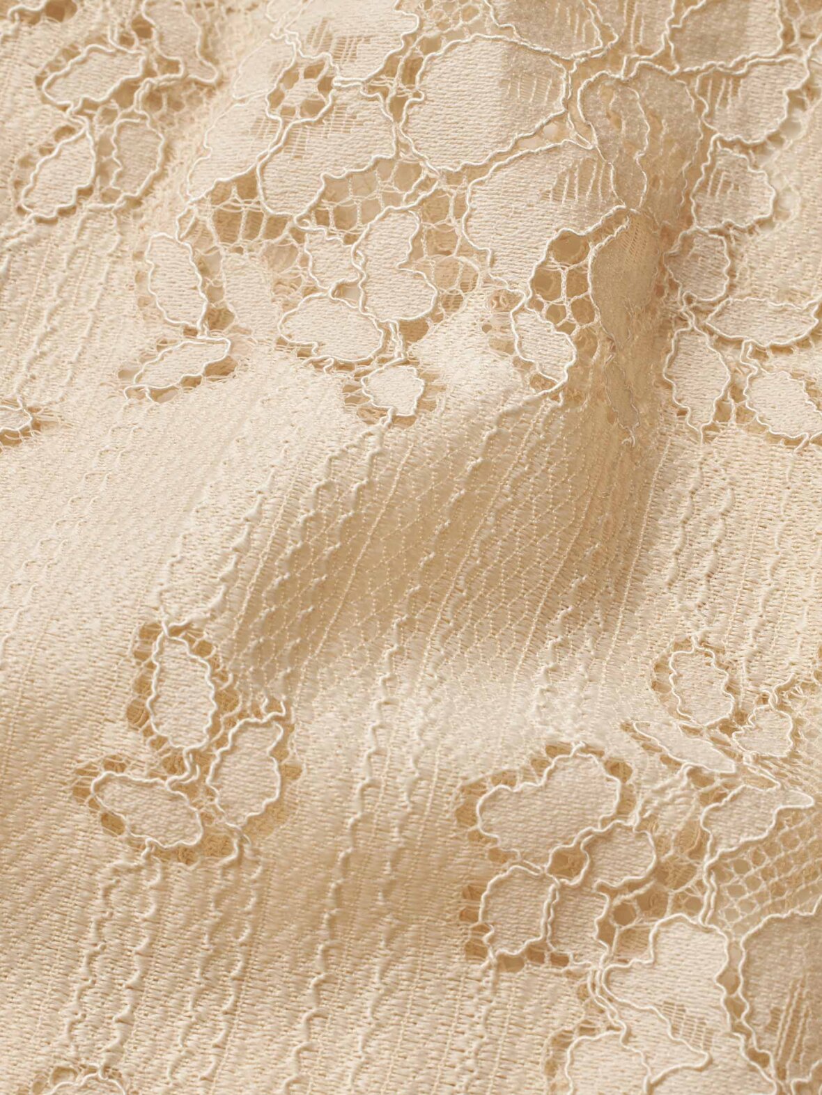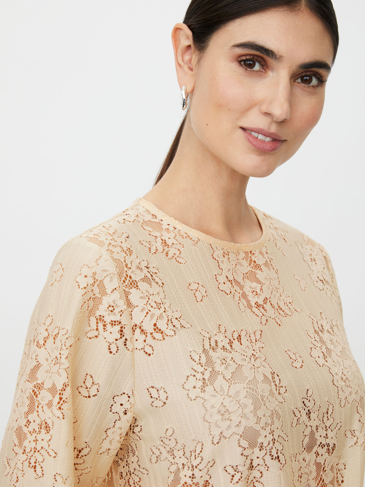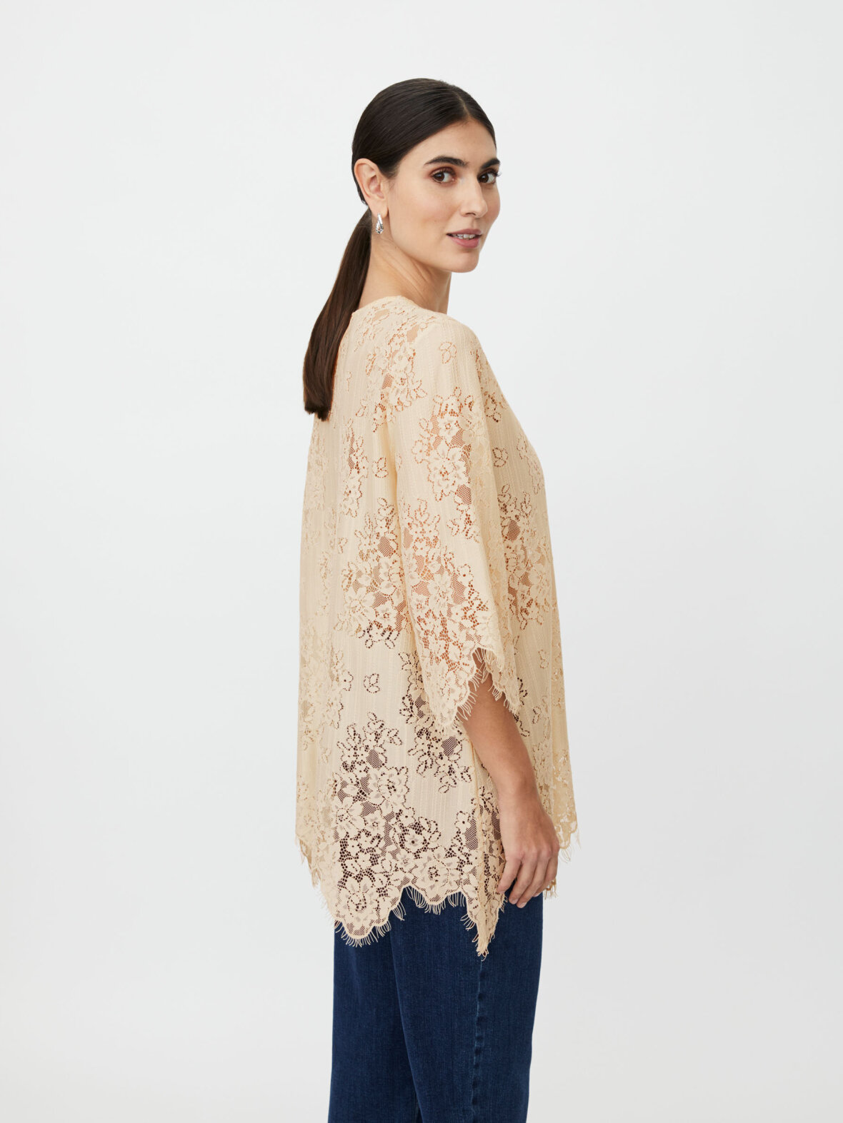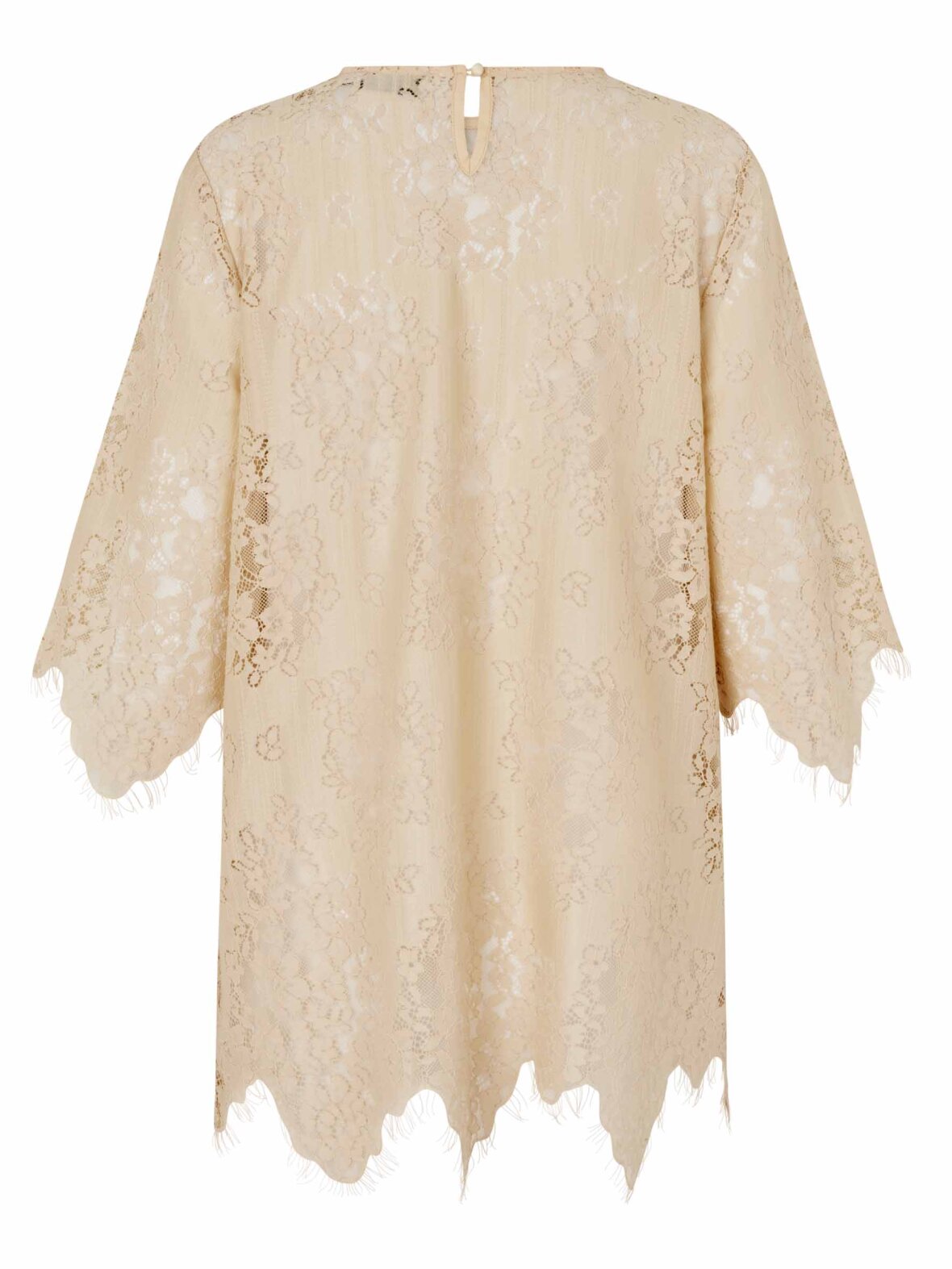 Denne luksuriøse blondetop er et af sæsonens must-haves og din genvej til et ubesværet, elegant look. De transparente blonder med bølgende afrunding og fine frynser skaber et feminint udtryk med lethed og bevægelse. Det A-formede snit falder blødt og flatterende ned over kroppen og gør toppen både smuk og behagelig at have på. Style den med cremefarvede bukser og gyldne smykker for et chikt, sommerligt look.