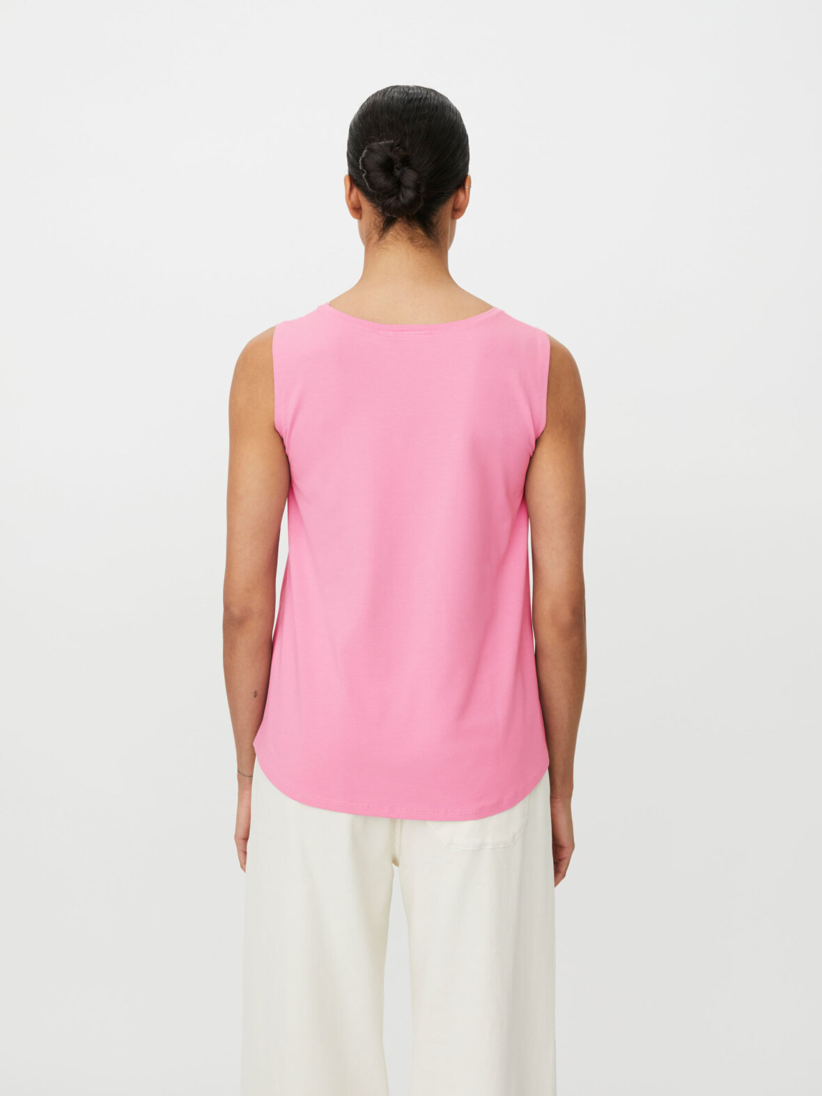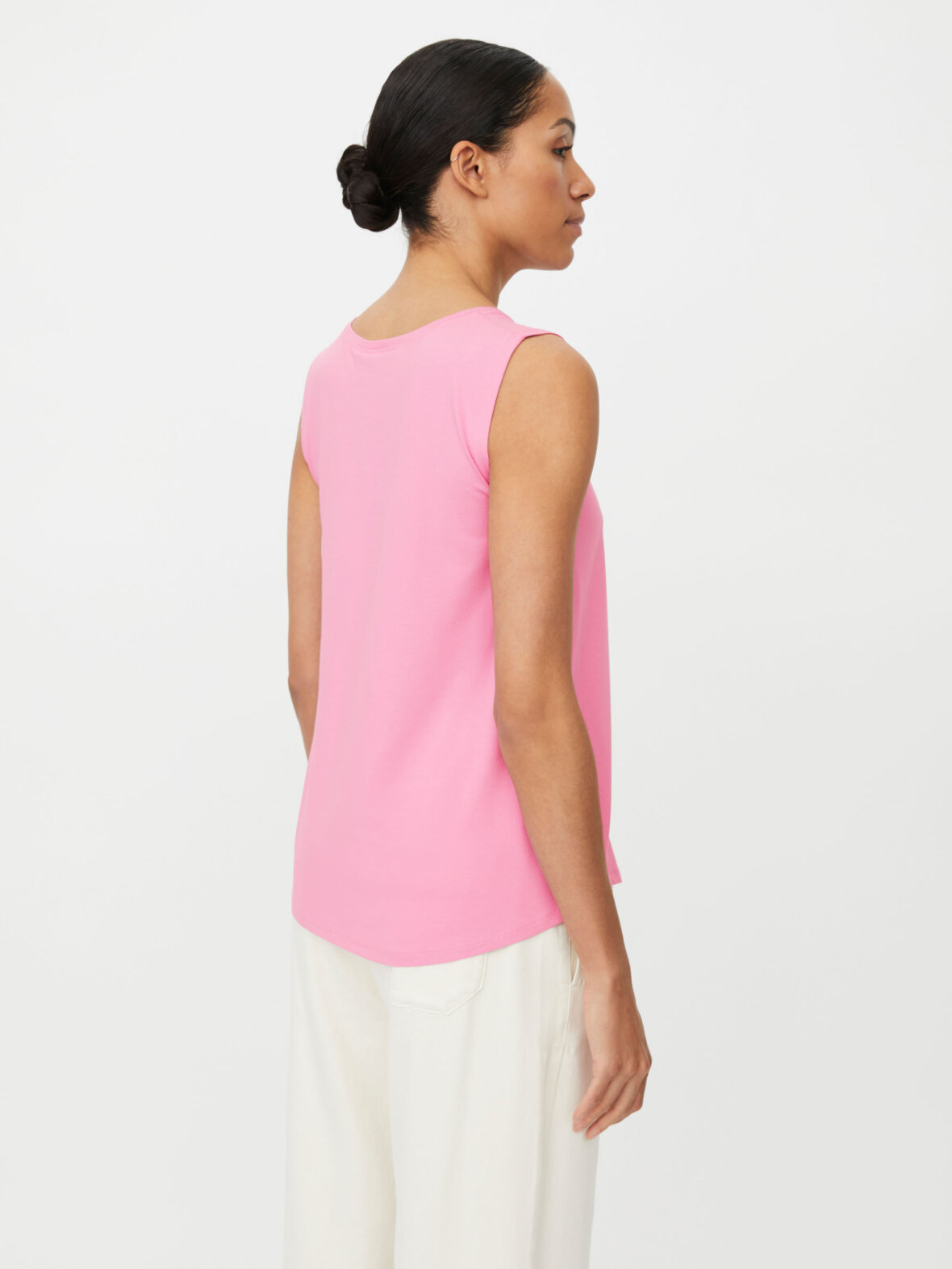 Denne ærmeløse basistop i smørblød jerseykvalitet er en af dem, du får lyst til at eje i alle farver. Materialet føles ultrablødt mod huden og giver en behagelig fornemmelse hele dagen. Det A-formede snit får toppen til at sidde flot til over brystet og falde let og naturligt ned over kroppen. Med sit enkle udtryk er den nem at style – brug den til jeans, nederdele eller som et ekstra, blødt lag inderst inde.
