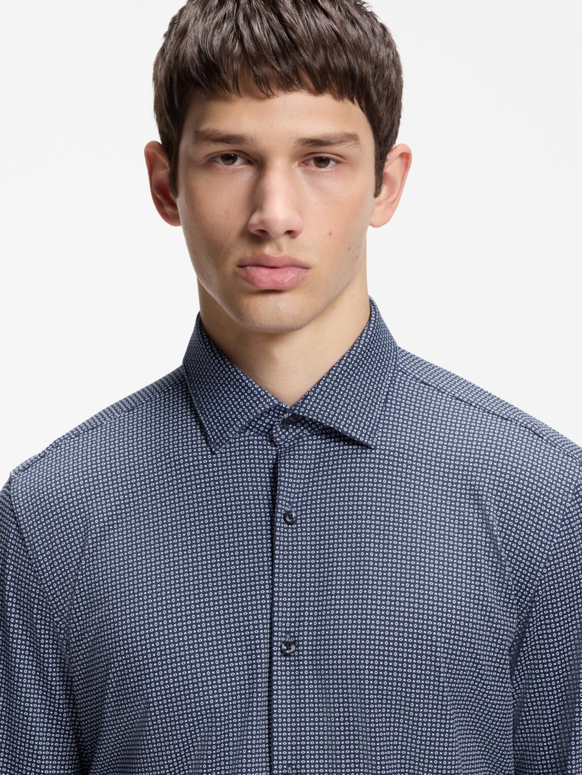 Denne slanke skjorte fra HUGO Menswear med generøs stræk, der giver et behageligt, fleksibelt fit, vil løfte dit businesslook. Karakteristisk heldækkende print.