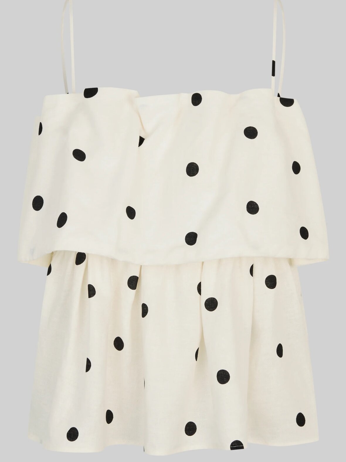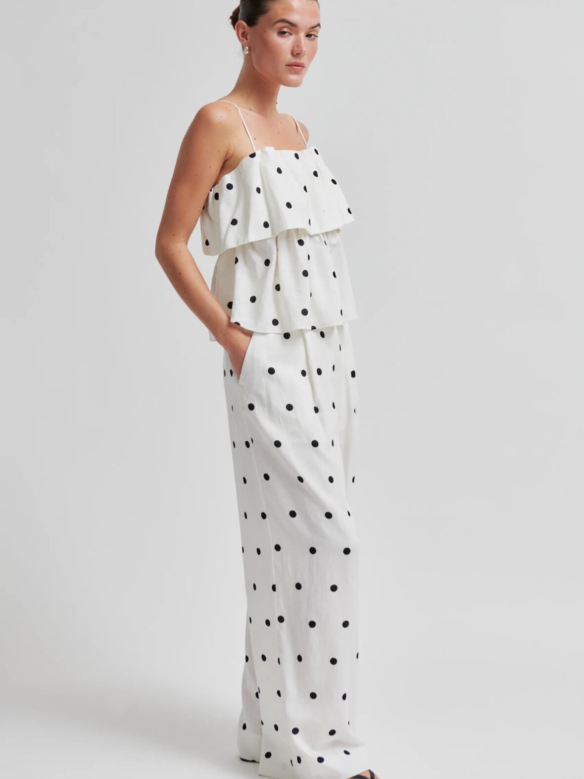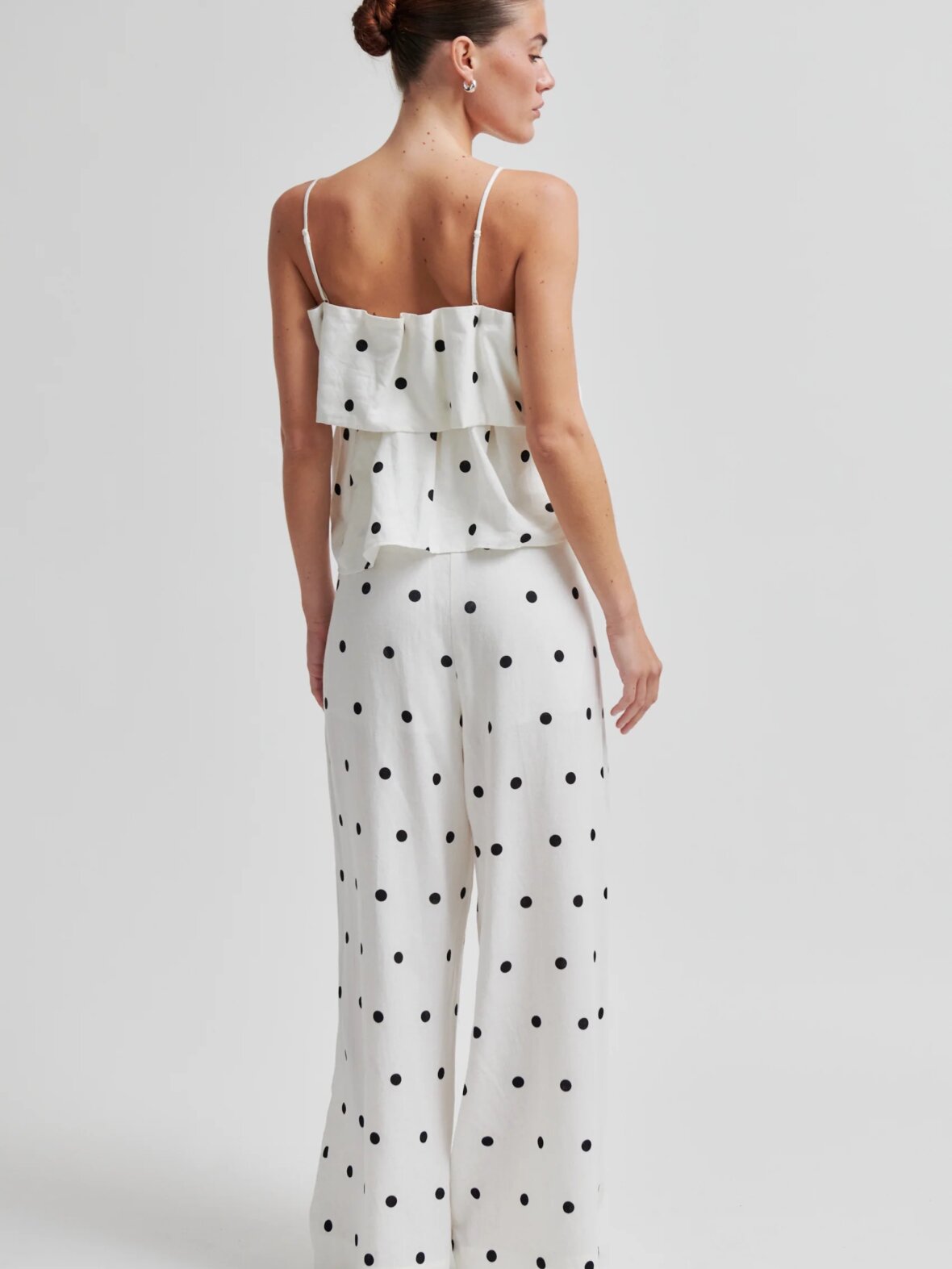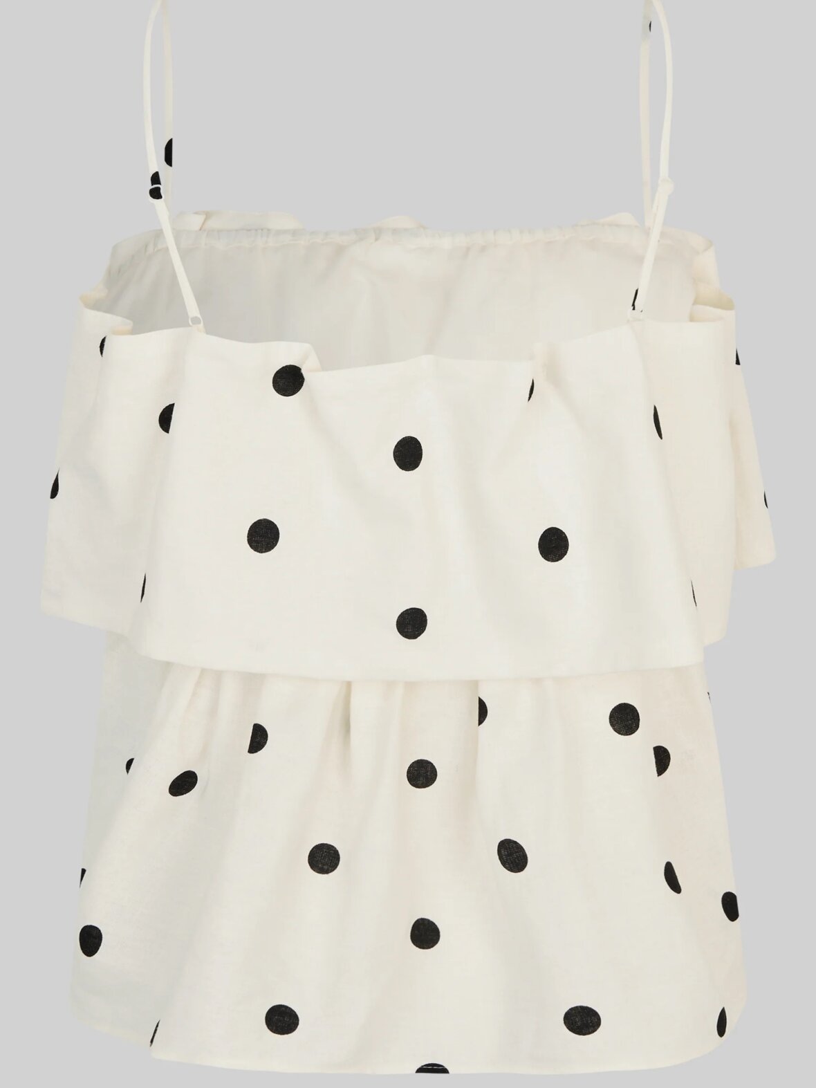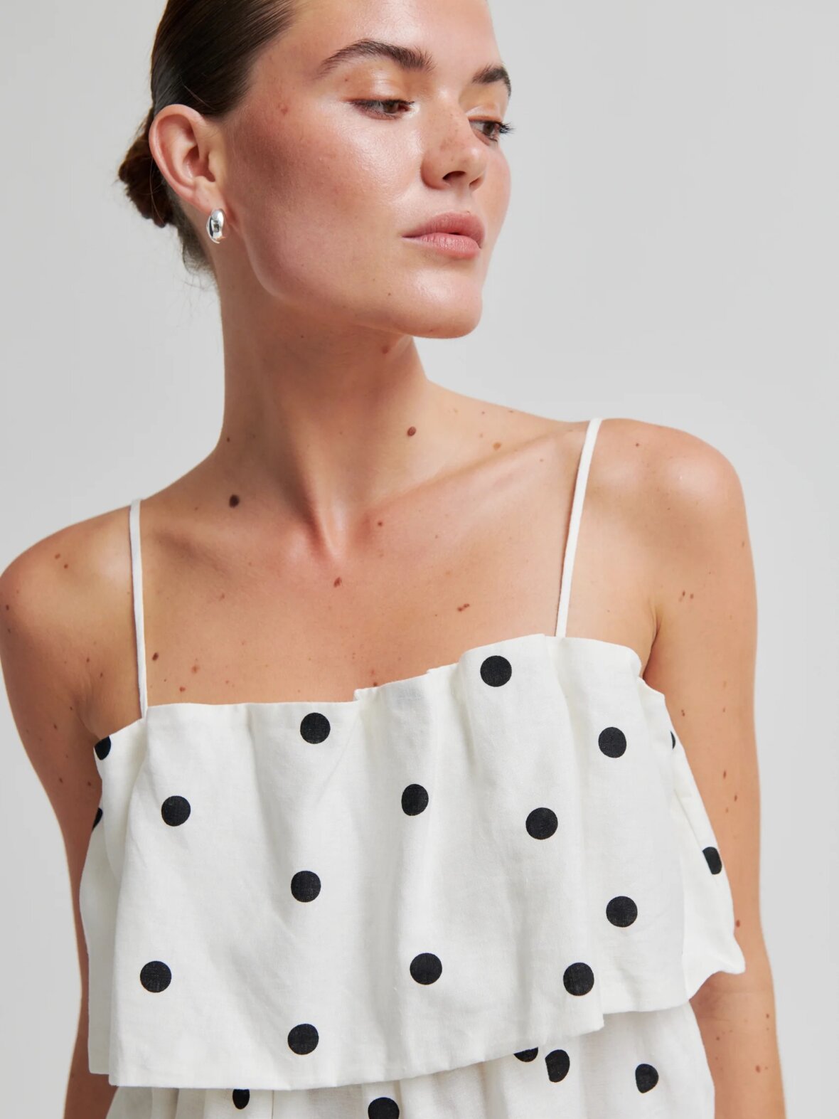 Second Female lagdelt polkaprikket top. Toppen er fremstillet i en let hør-viskoseblanding med gennemgående polkaprikket mønster. Med tynde, regulerbare skulderstropper og elastik på indersiden af den øverste kant. Flæser ved bryst for ekstra volumen. Normal pasform.
