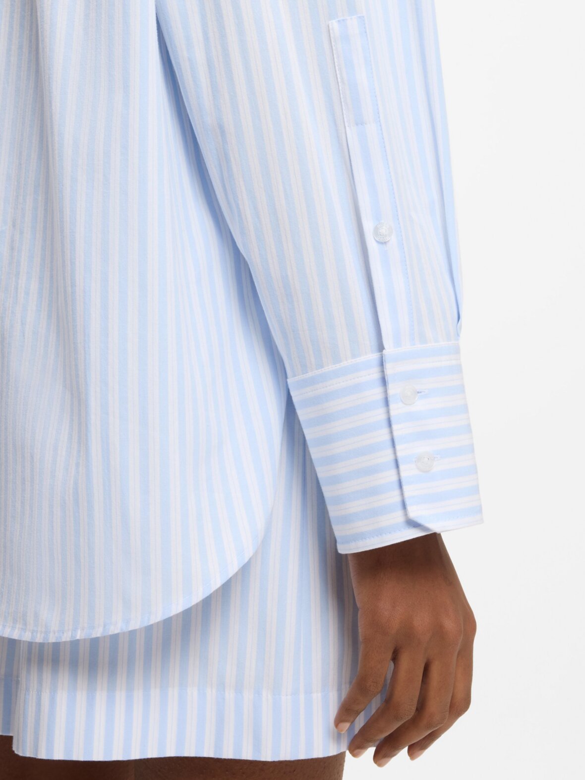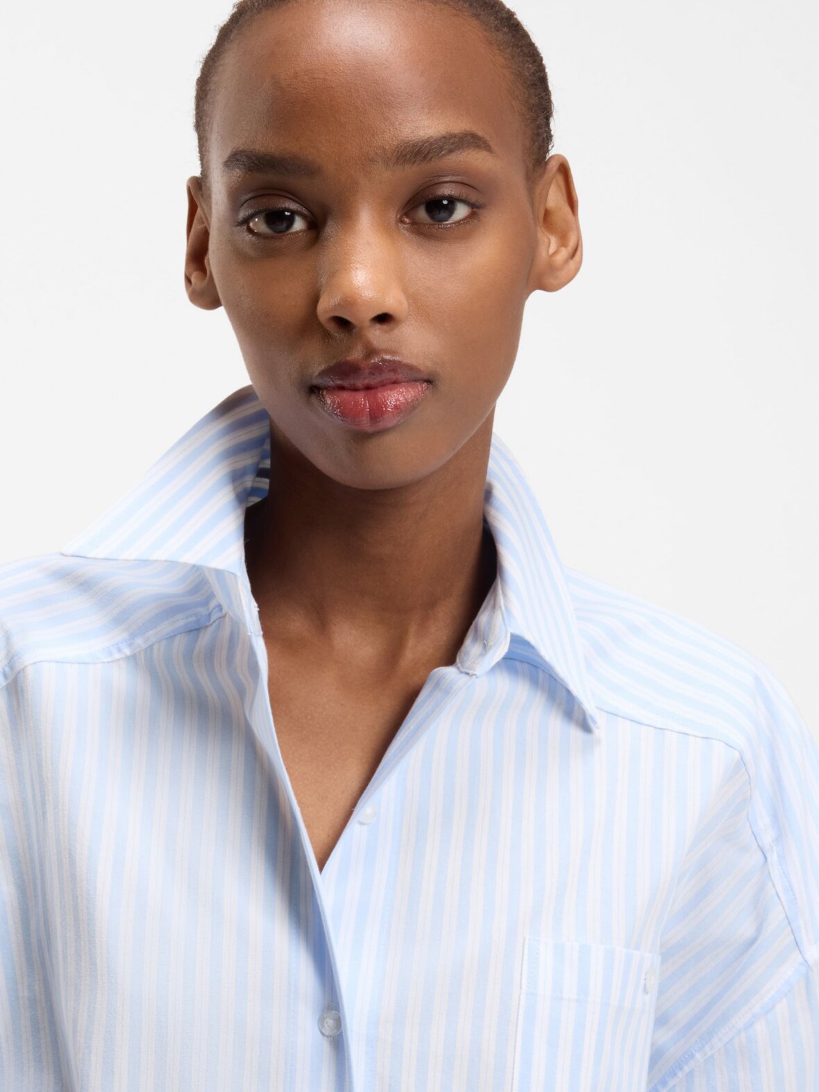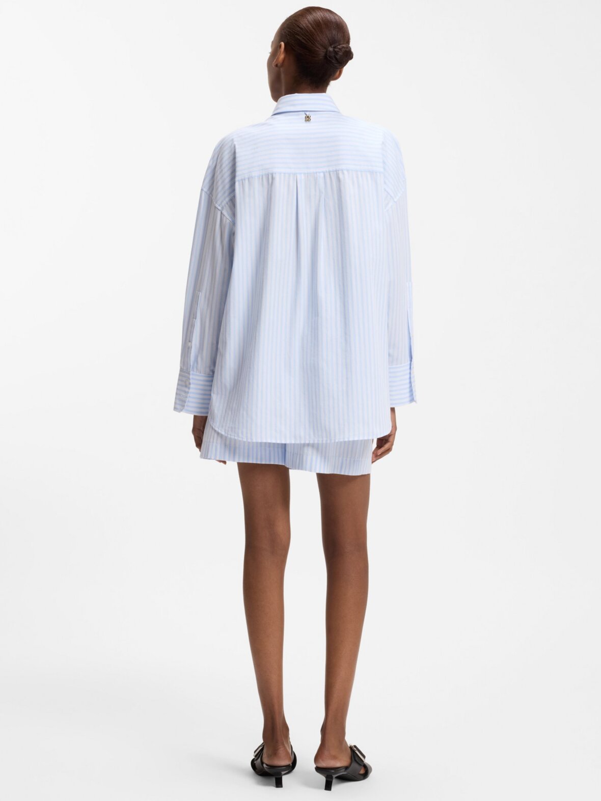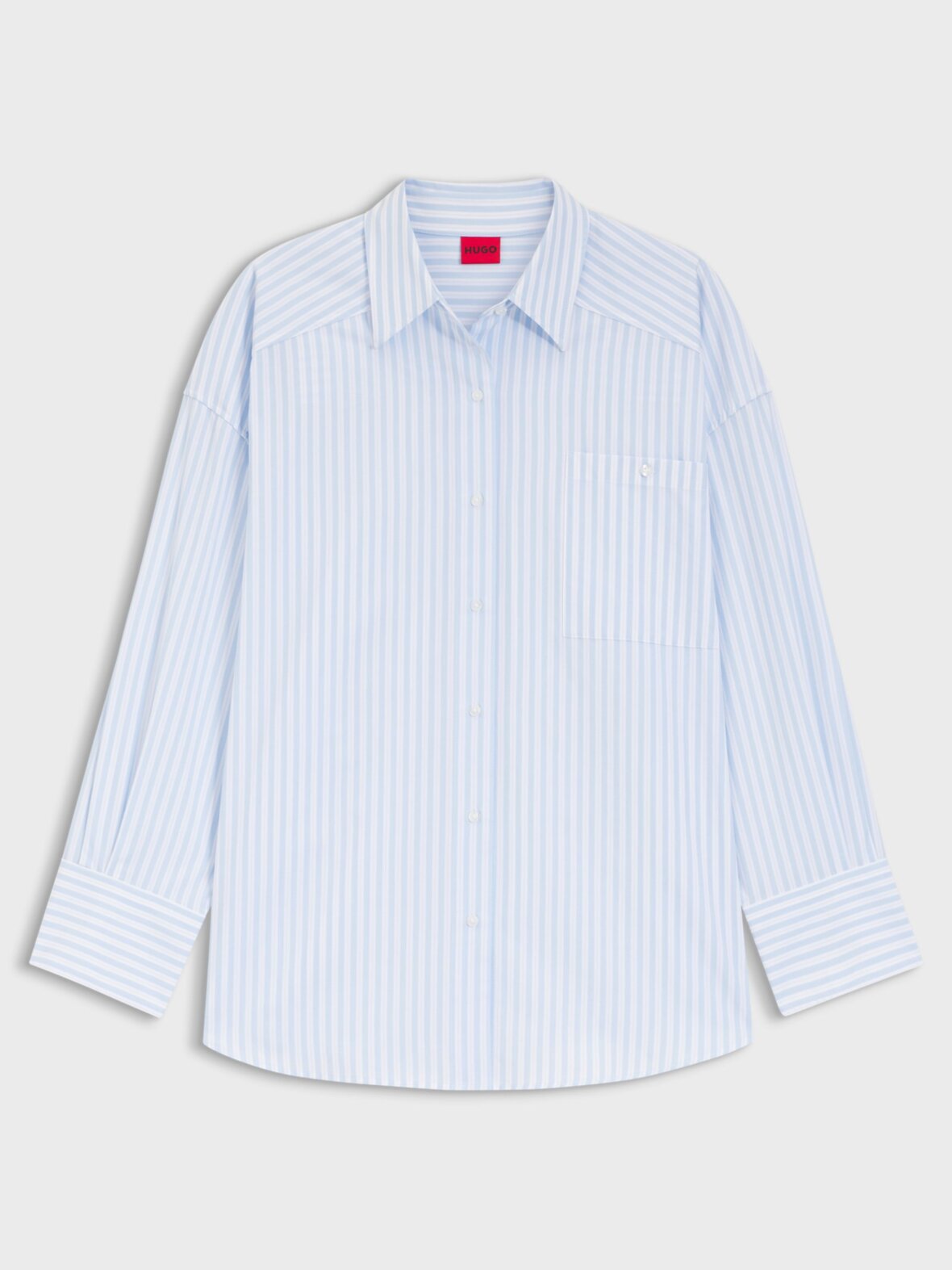 Denne HUGO Womenswear-bluse har et oversized fit og er fremstillet af stribet bomuldspoplin for et tidløst stil. Metallisk logo i halsen. Brystlomme.