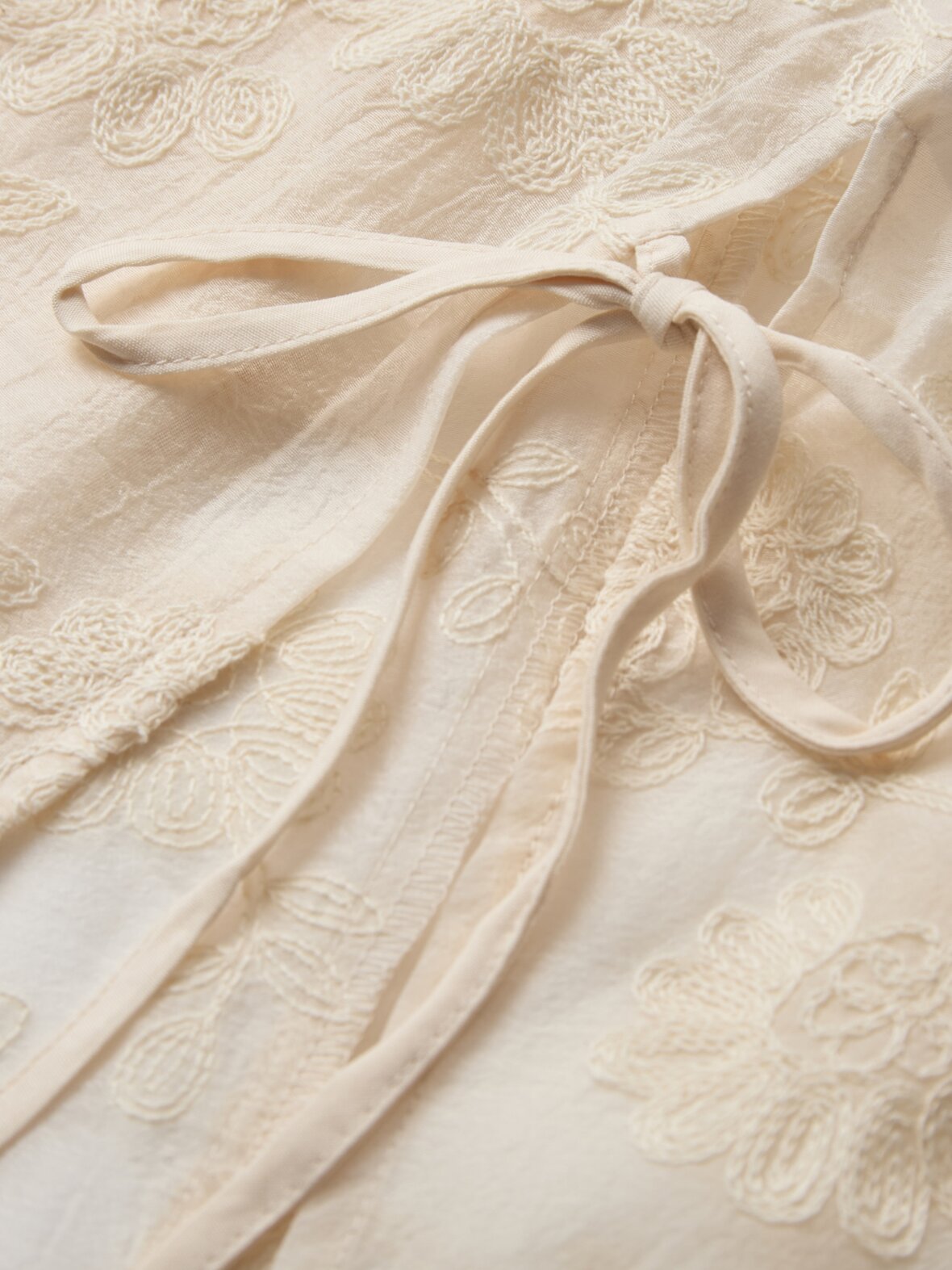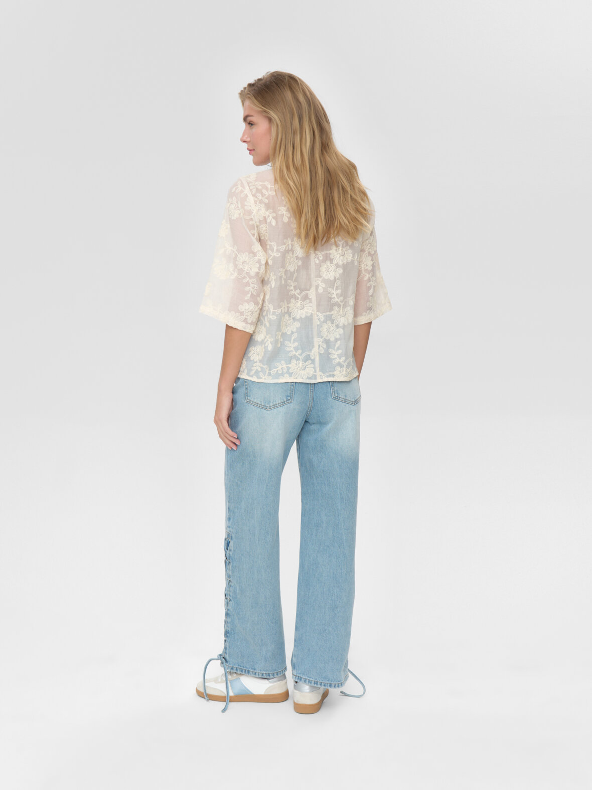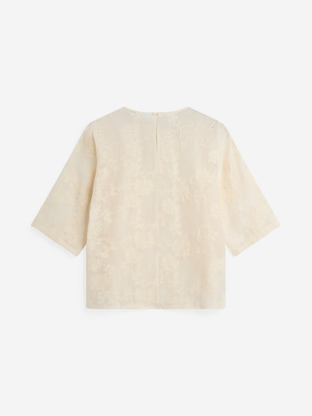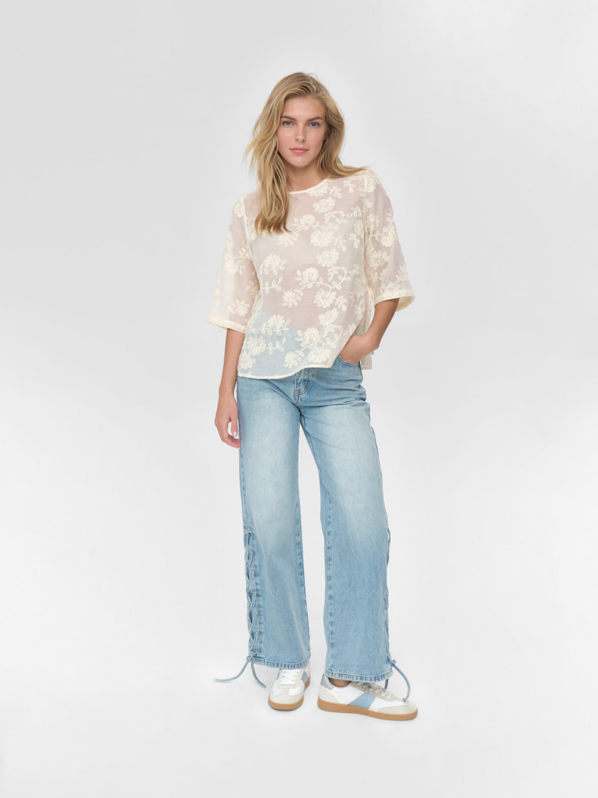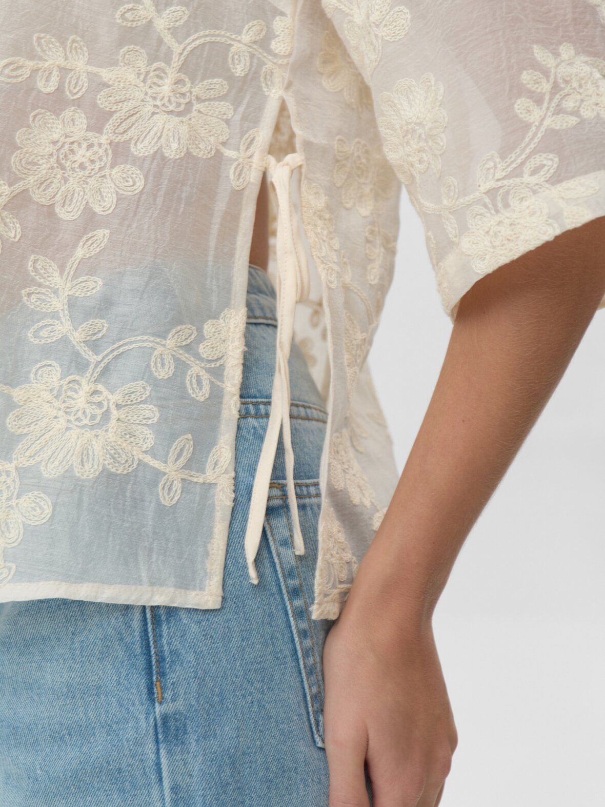 Feminin kortærmet jaquardbluse med smukt mønster. Lille bindedetalje i siden.